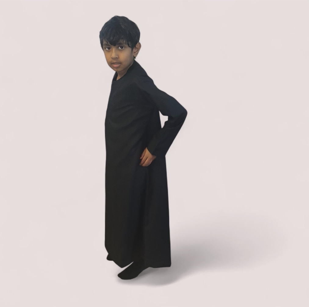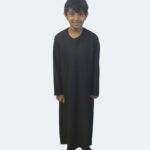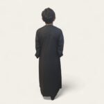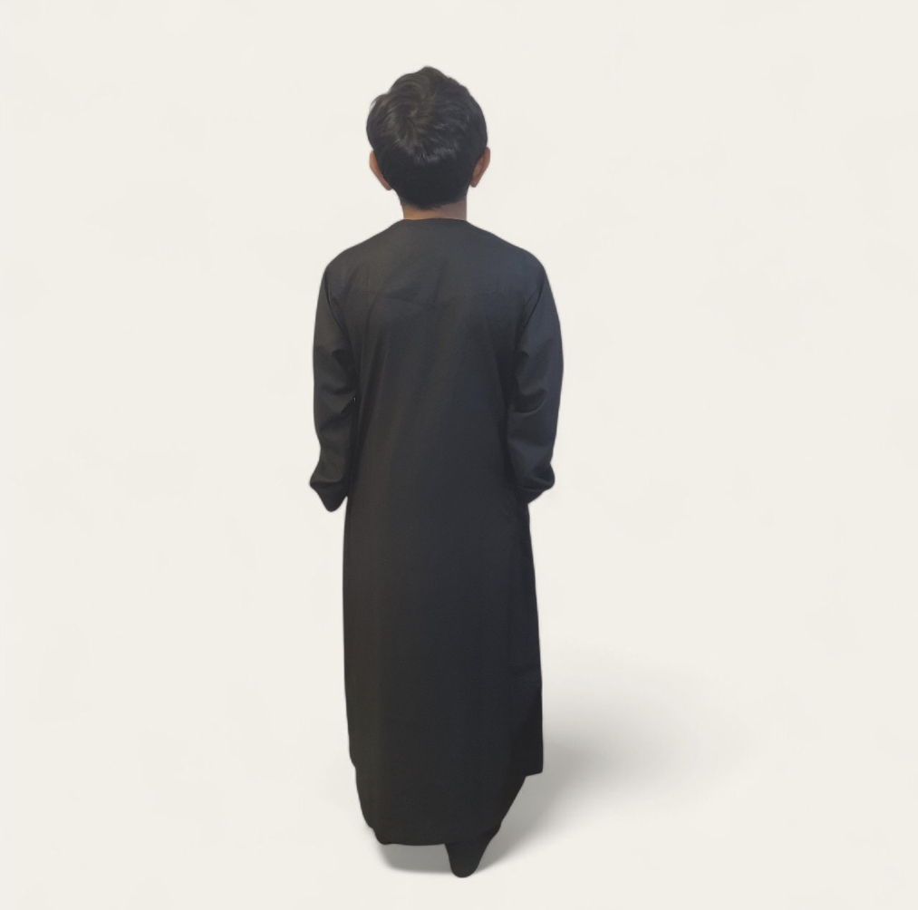 Classic, refined, and timeless — this Black Omani Style Boys Thobe / Jubbah embodies elegance with a traditional touch. Designed with the signature Omani cut, it features a clean round neck. The deep black shade adds sophistication, making it perfect for prayers, Eid celebrations, weddings, and formal gatherings.