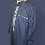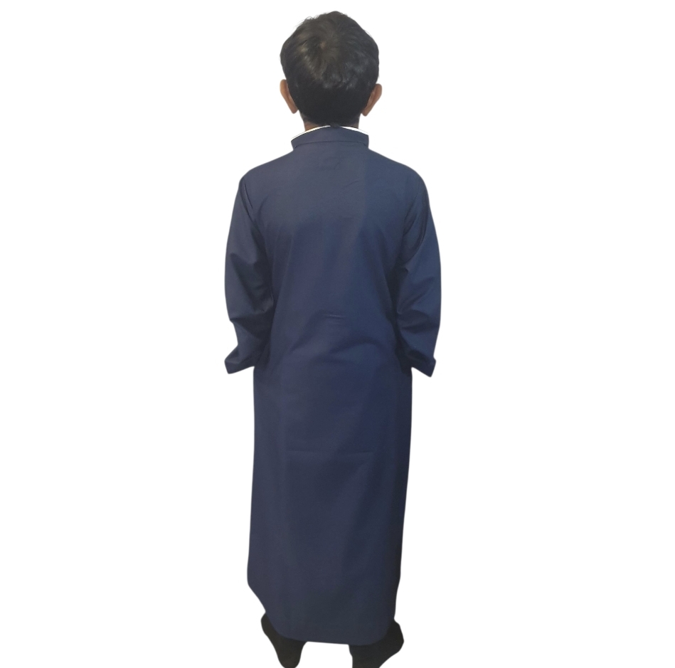 * The thobe comes in a navy color with white trim, creating a stylish contrast.
