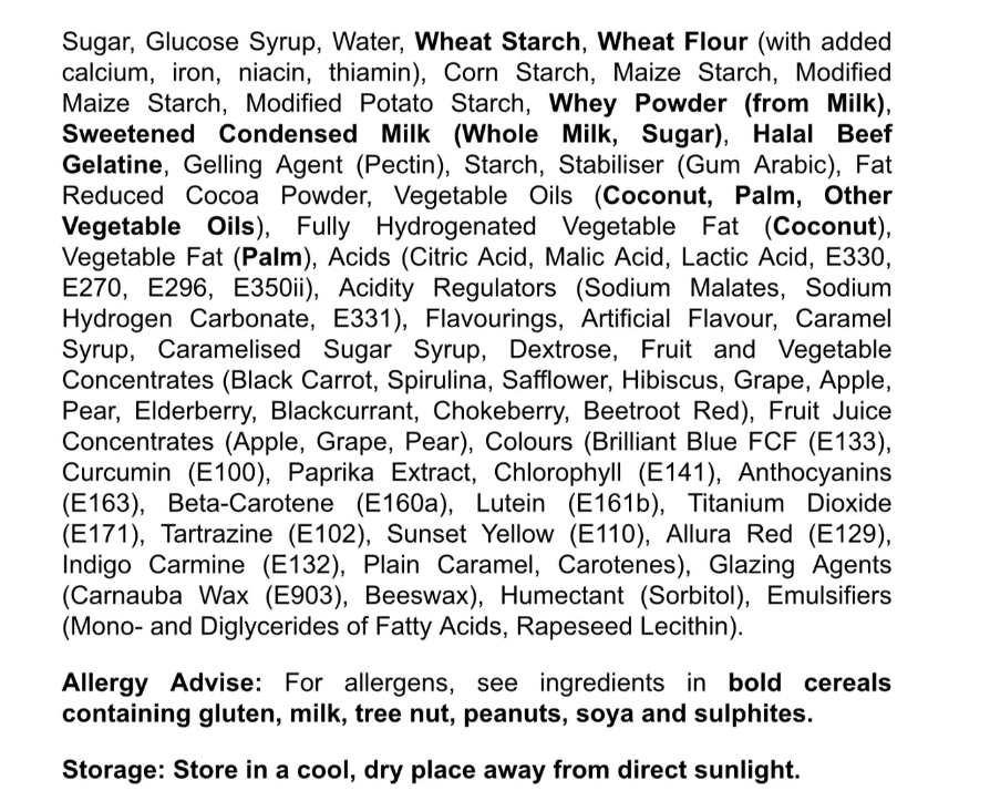 Glucose Syrup, Sugar, Corn Starch, Water, Acids (Malic Acid, Citric Acid), Flavouring, Acidity Regulator (E331), Colour (E133)