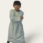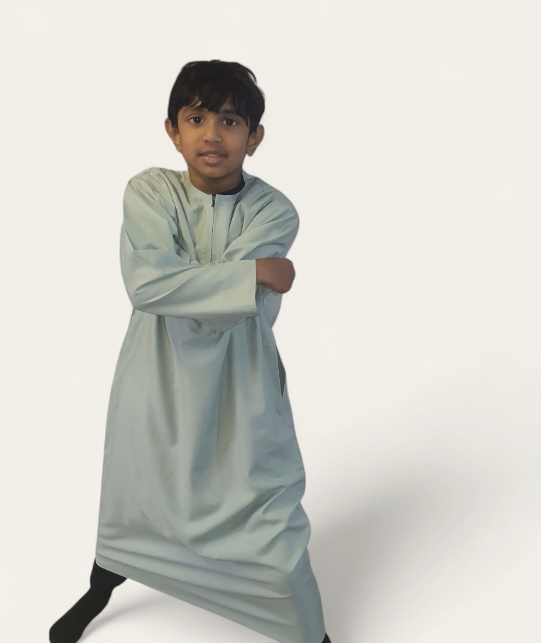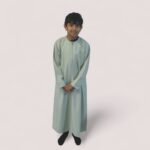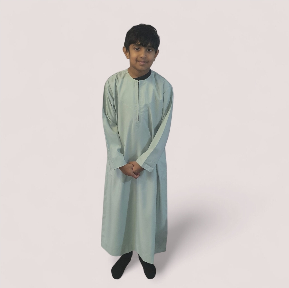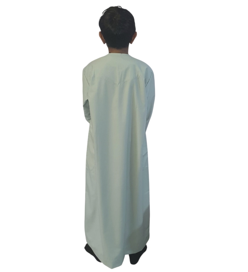 * This mint green boys thobe is designed in Omani style. Perfect for traditional Islamic wear, it offers a classic look for young boys.