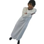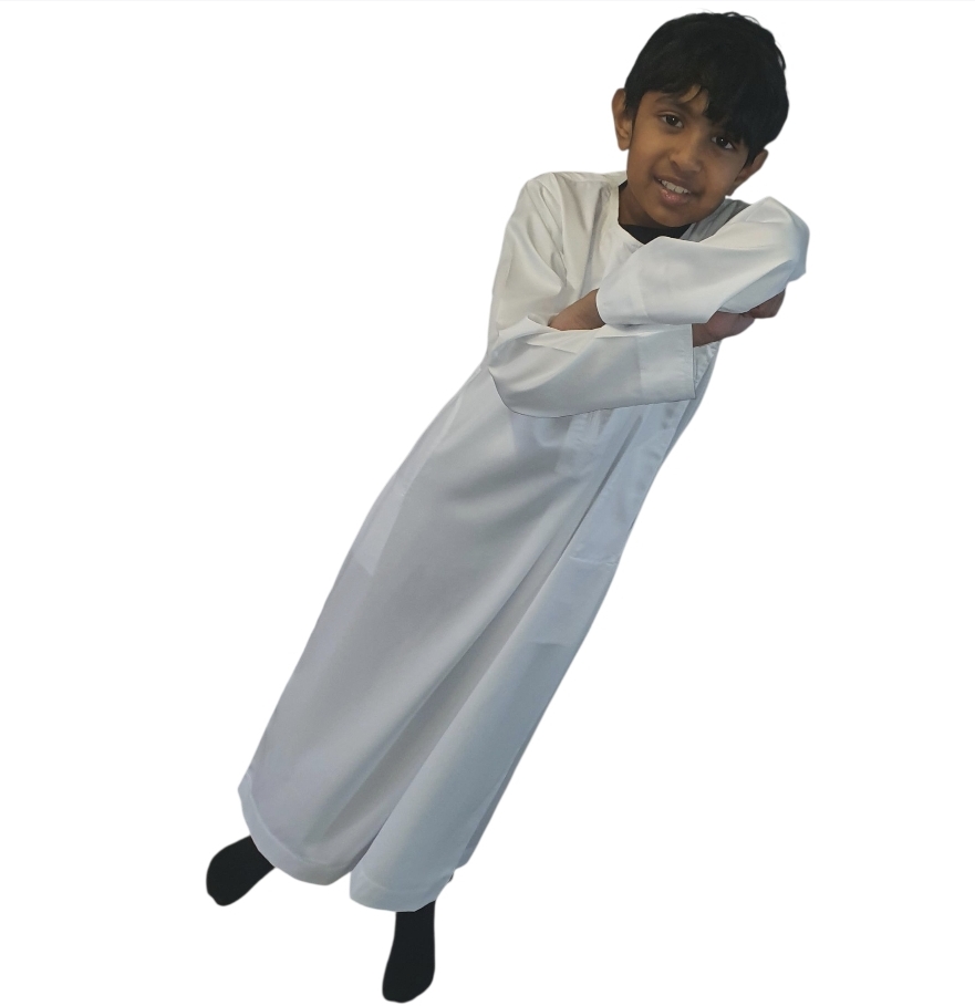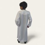 This elegant Omani-style boys thobe is designed for comfort and sophistication. Crafted from a premium shiny off-white fabric, it reflects a subtle sheen under light, giving a touch of luxury perfect for special occasions, Eid, Friday prayers, or family gatherings.